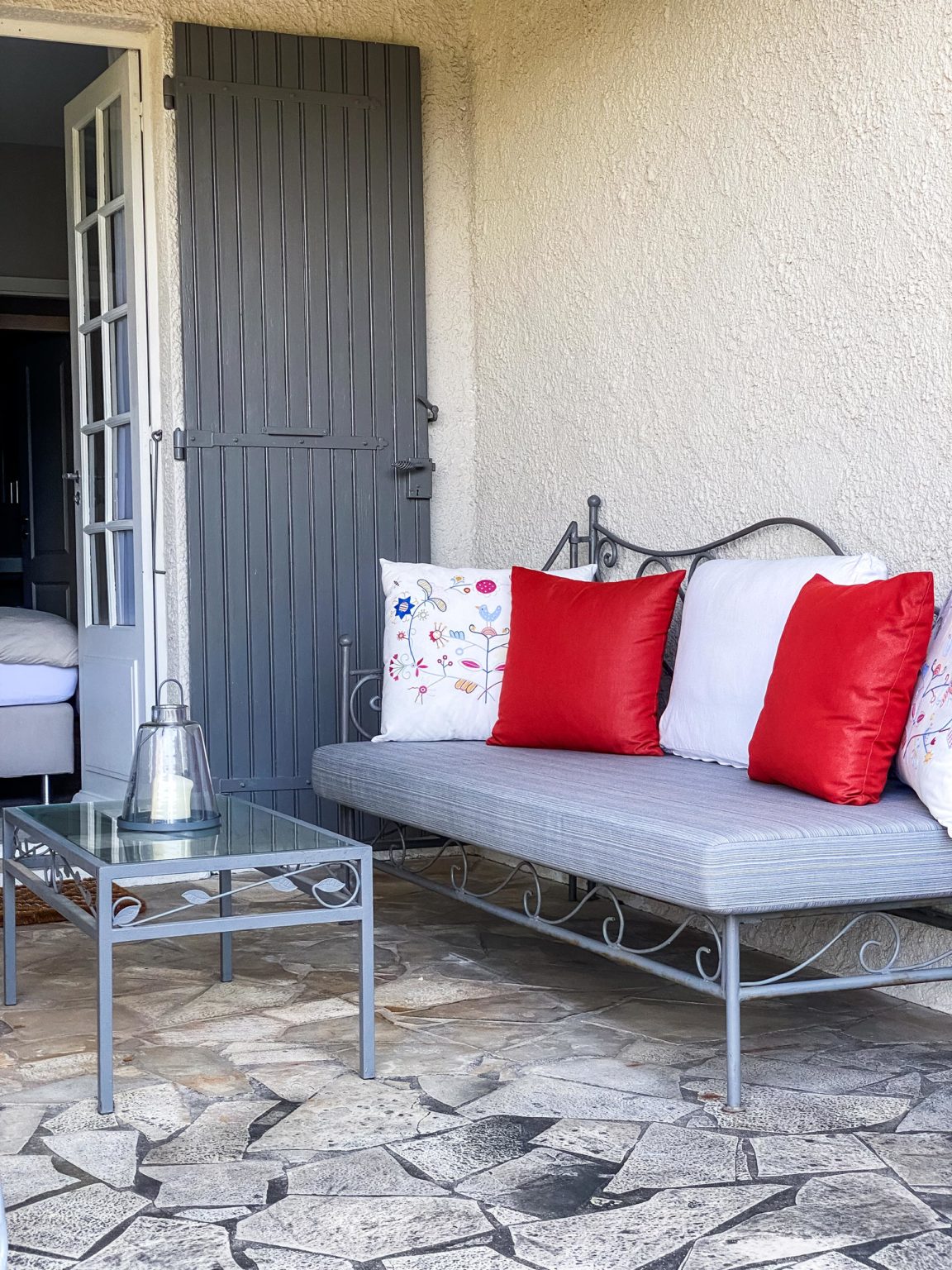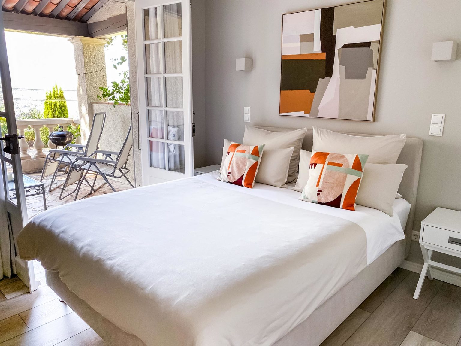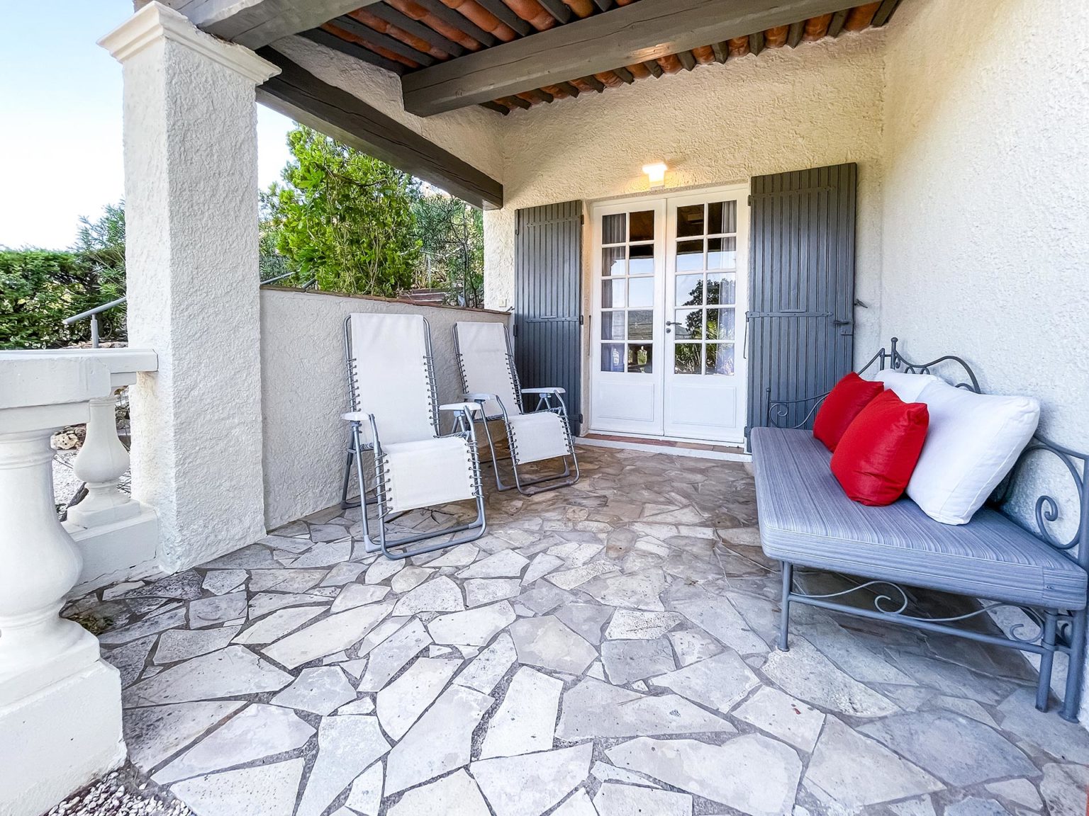Das Appartement La Provence befindet sich im Erdgeschoss mit einer Größe von circa 55 m², bietet Platz für 2-4 Personen und ist über einen eigenen Eingang zugänglich. Es verfügt über ein Wohnzimmer mit Schlafsofa (160 x 200 cm), einen Küchenbereich, ein Master –Schlafzimmer mit Boxspringbett (160 x 200 cm), ein Bad mit Walk-In-Dusche und eine separate Toilette. Eine überdachte Terrasse ist vom Schlafzimmer aus erreichbar und möbliert mit Sitzgelegenheiten und einem bequemen Daybed. Eine zweite wunderschöne Sommerterrasse mit großzügigem Essbereich, Sonnenschirm und Liege gehört ebenfalls zu diesem Appartement, sowie eine Terrasse, die im oberen Teil des Grundstücks liegt und mit einen traumhaften Panoramablick auf das Meer, die Bucht von Saint Tropez und die umliegenden Berge begeistert.